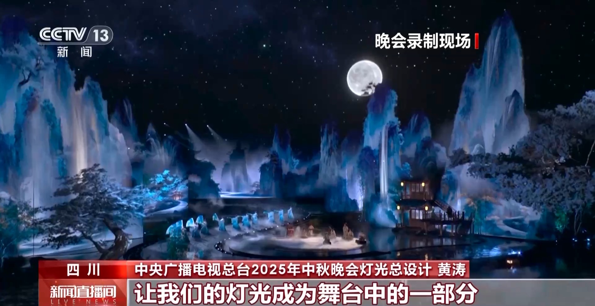 中央广播电视总台2025年中秋晚会灯光总设计 黄涛:我们希望的是把灯藏起来。希望能通过演绎的一种表达,诗意的表达,让我们的灯光成为舞台中的一部分。既做到了渲染,又做到了整个的铺垫,使人物的光更舒服,使所有的景别更加沉浸。